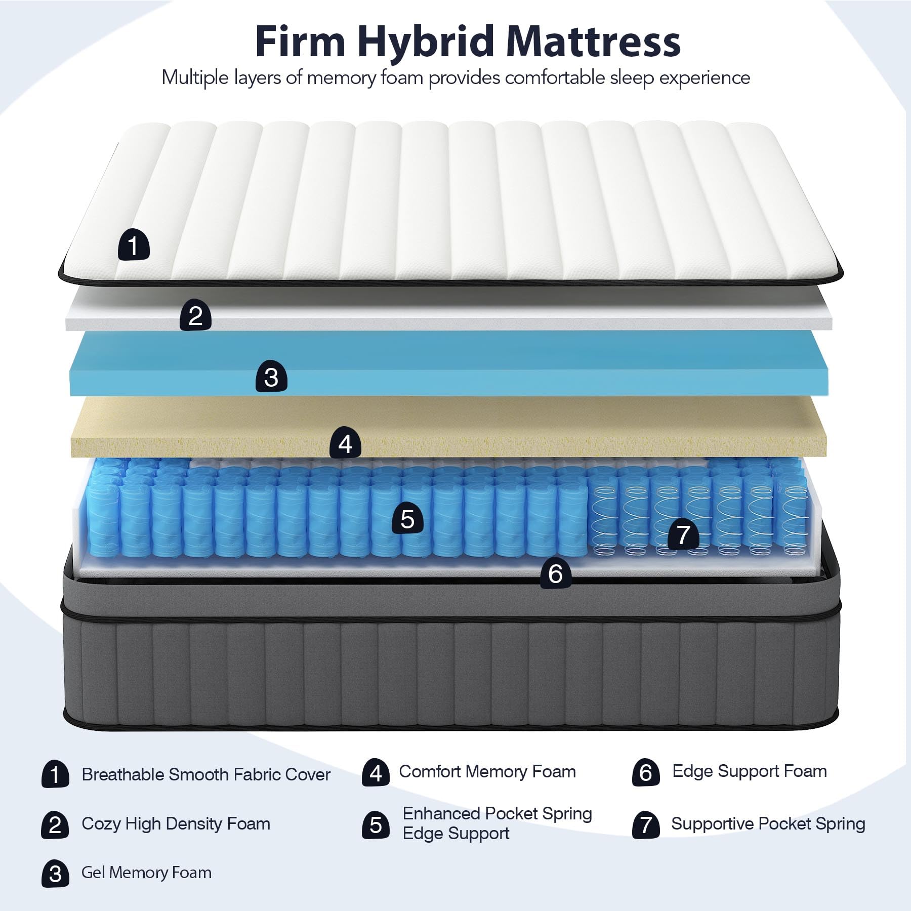 - Enhanced Edge Support —— The queen size hybrid mattress is built with reinforced edge support using three layers of coils. This firm 16 inch queen mattress offers superior stability and prevents sagging, ensuring long-lasting durability and consistent comfort across the entire surface.Made with gel memory foam, this mattress is designed to help keep you cool and comfortable throughout the night